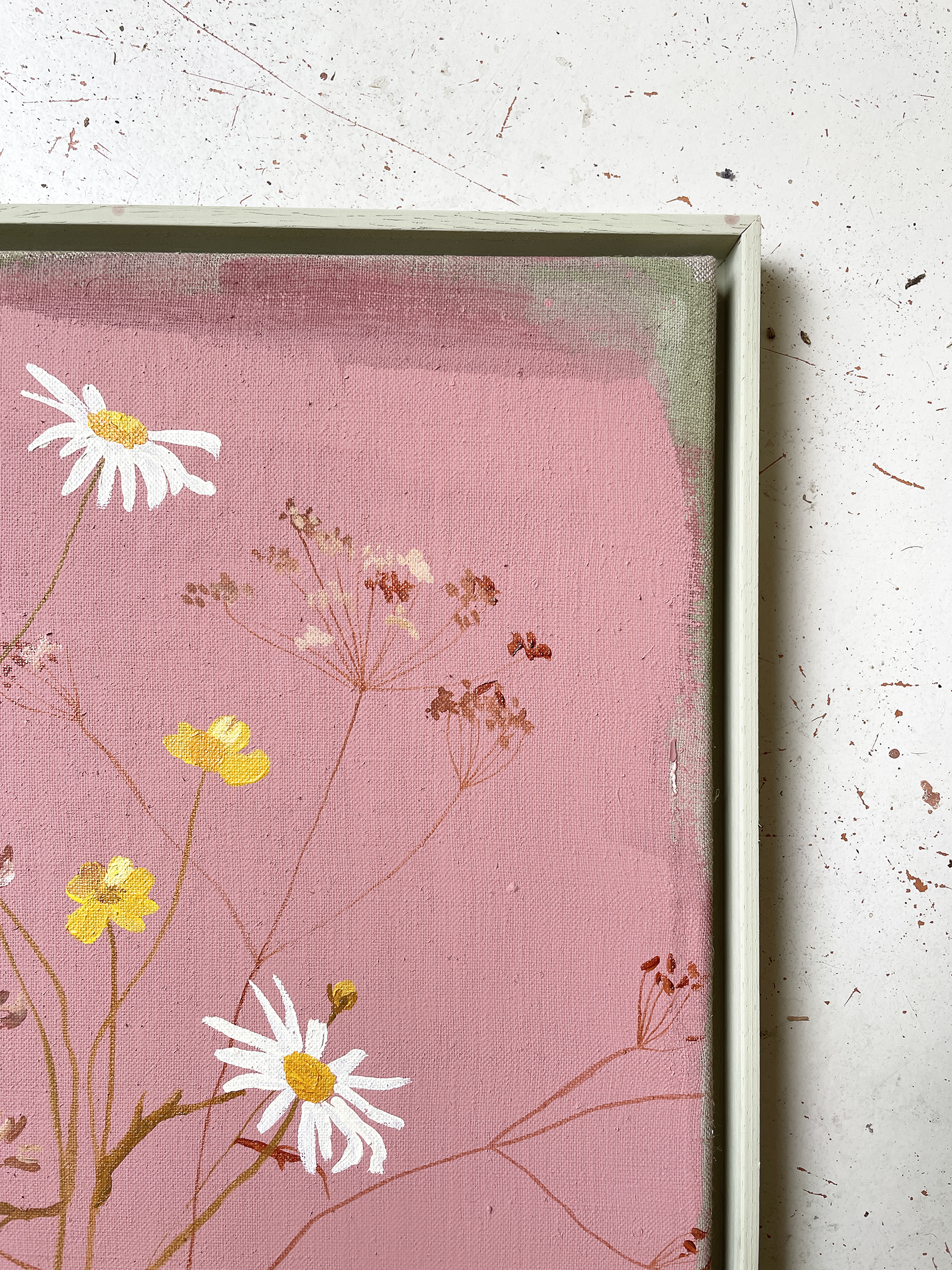 a warm yellow background featuring daisies, buttercup and cow parsley in orange, sap green and bright yellow tones.