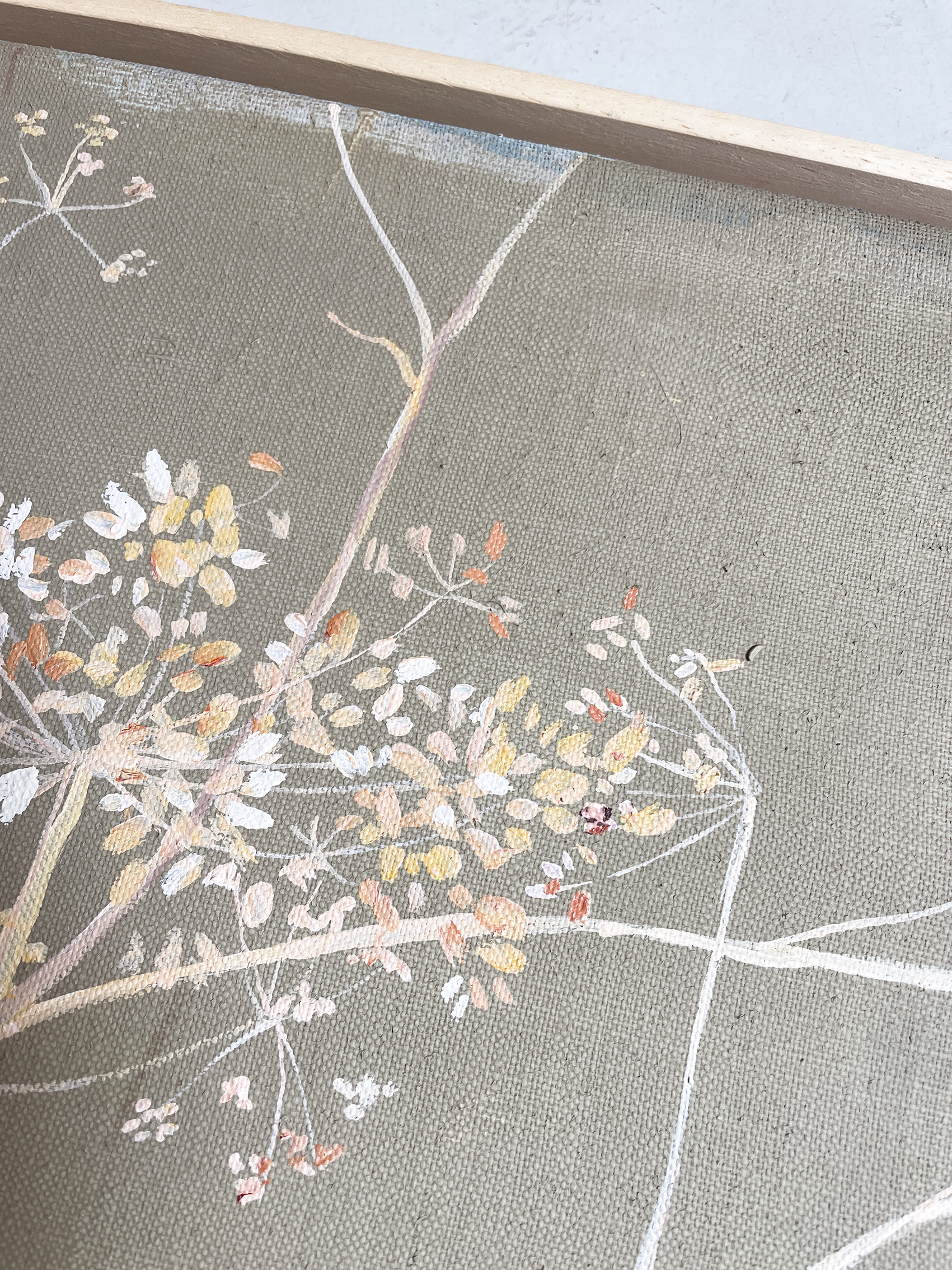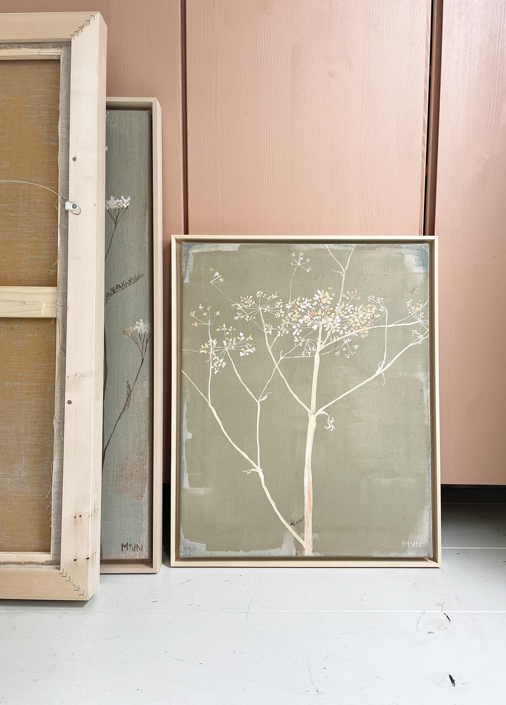 featuring a dried out Angelica stem from last year. painted in yellow and white tones on an olive green background.