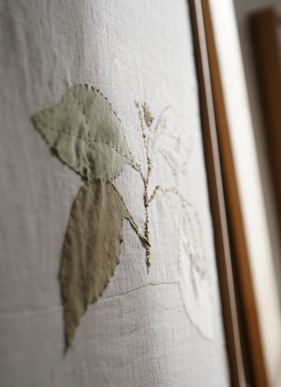 a linen and cotton patchwork panel, made and embroidered in the past year using bits of fabric we still have left from previous projects.
