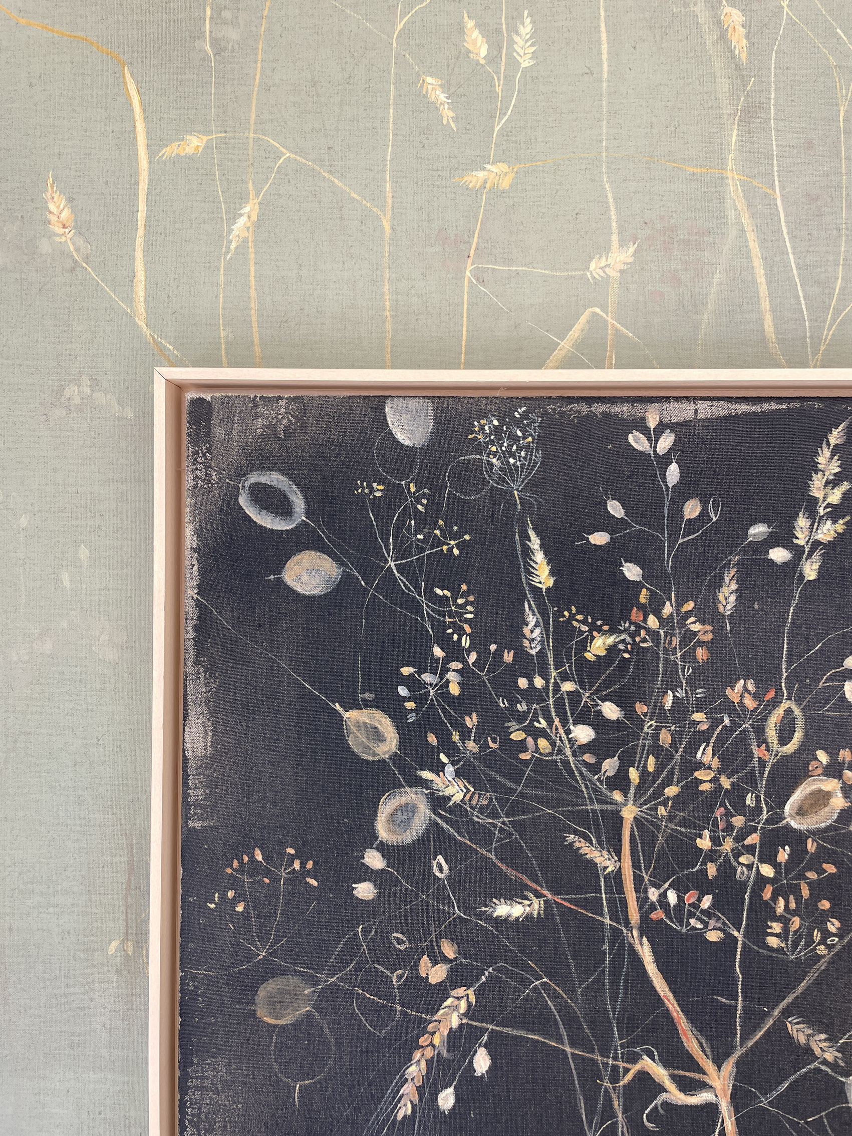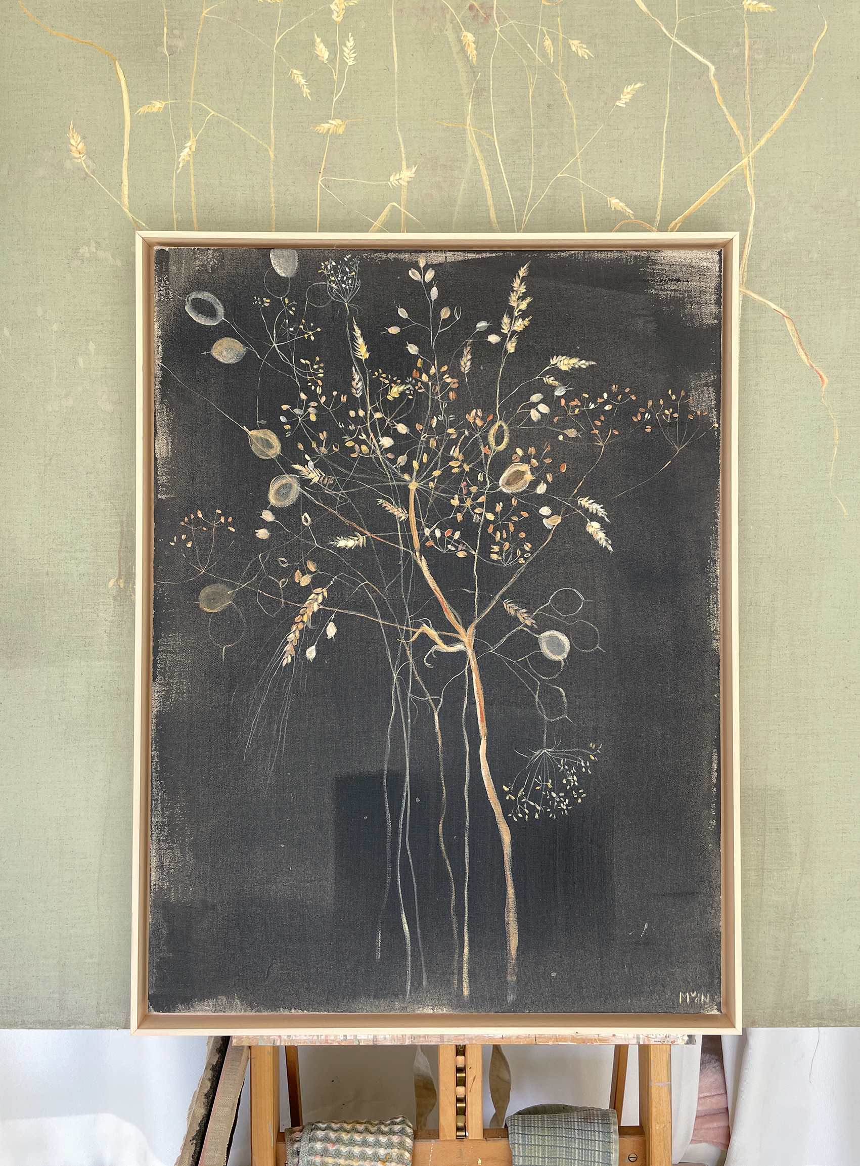 painted in shades of straw, mustard, mushroom and a bit of brown/red on black background.