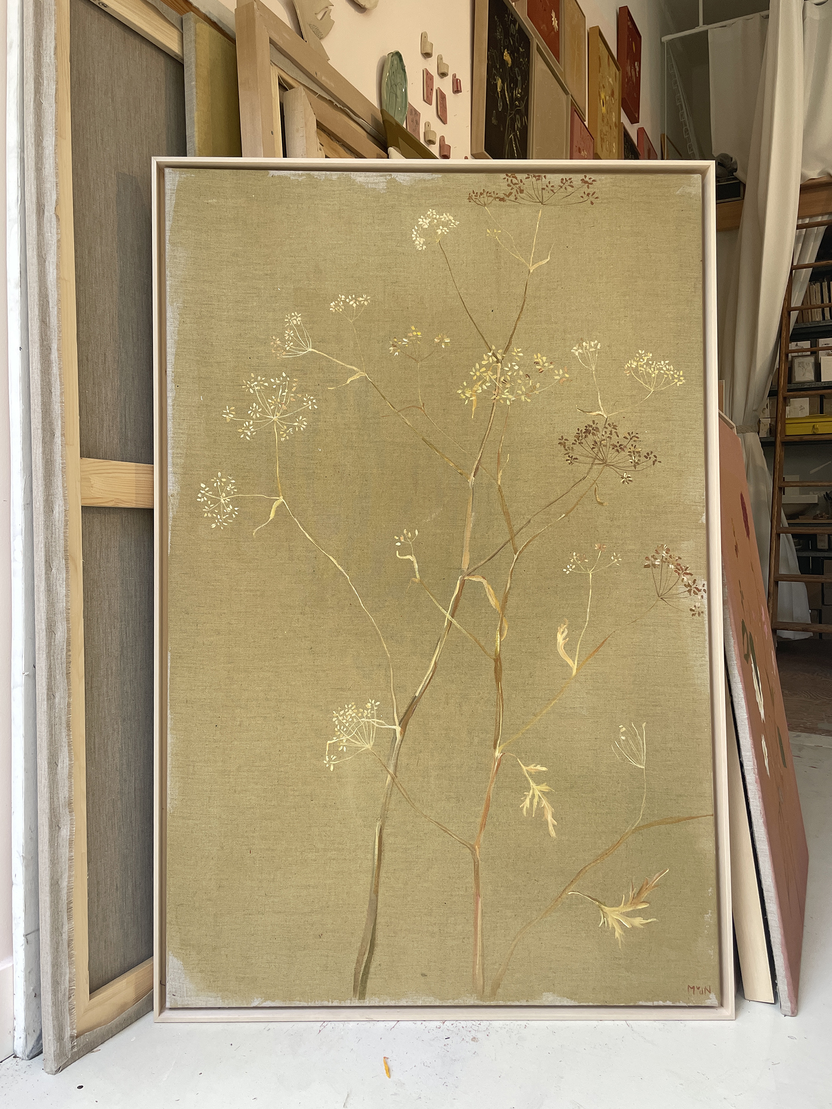 a dried out fennel and wild carrot are painted on a moss toned background.
