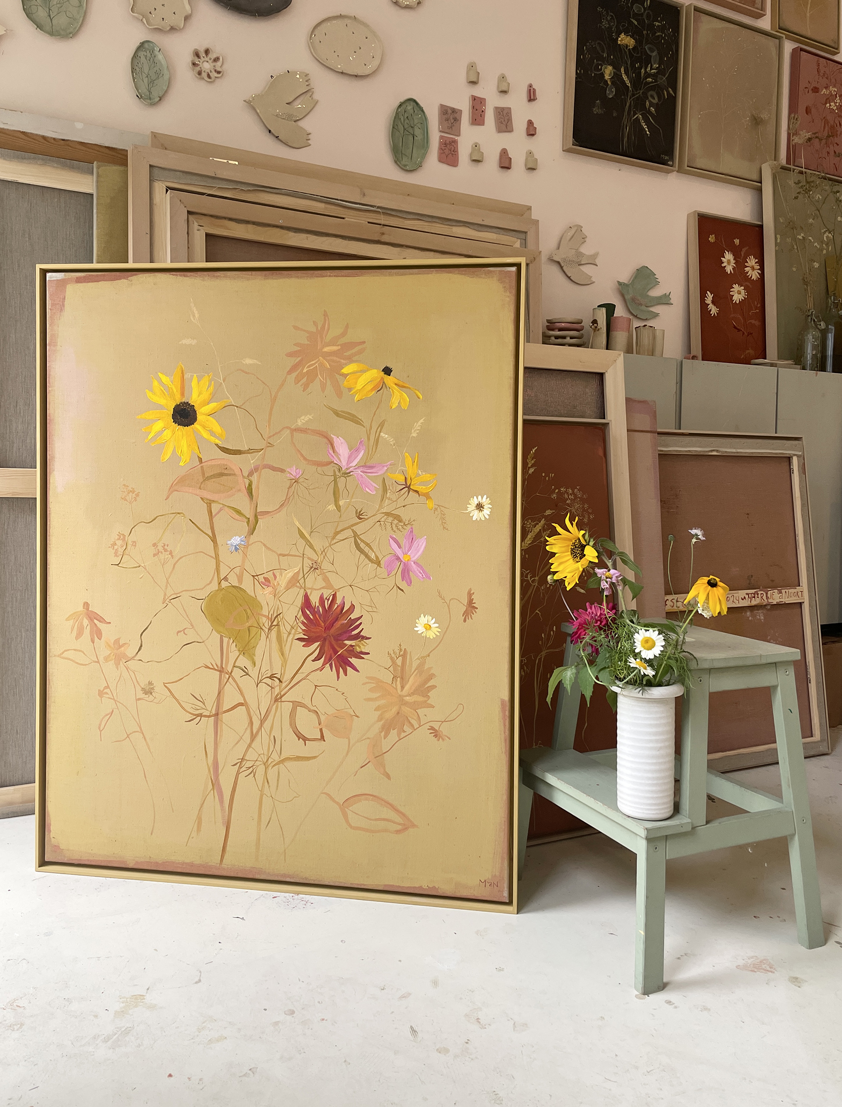 a study of several september flowers from the studio garden (like dahlia, cosmos, astrantia and a sunflower) on a straw yellow background with a warm pink undercurrent.
