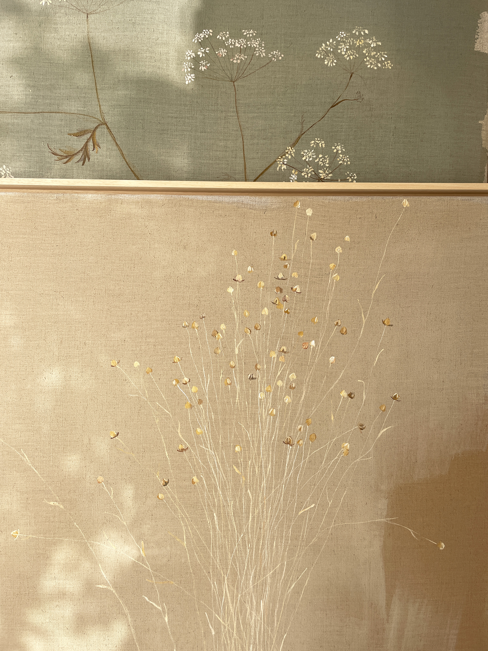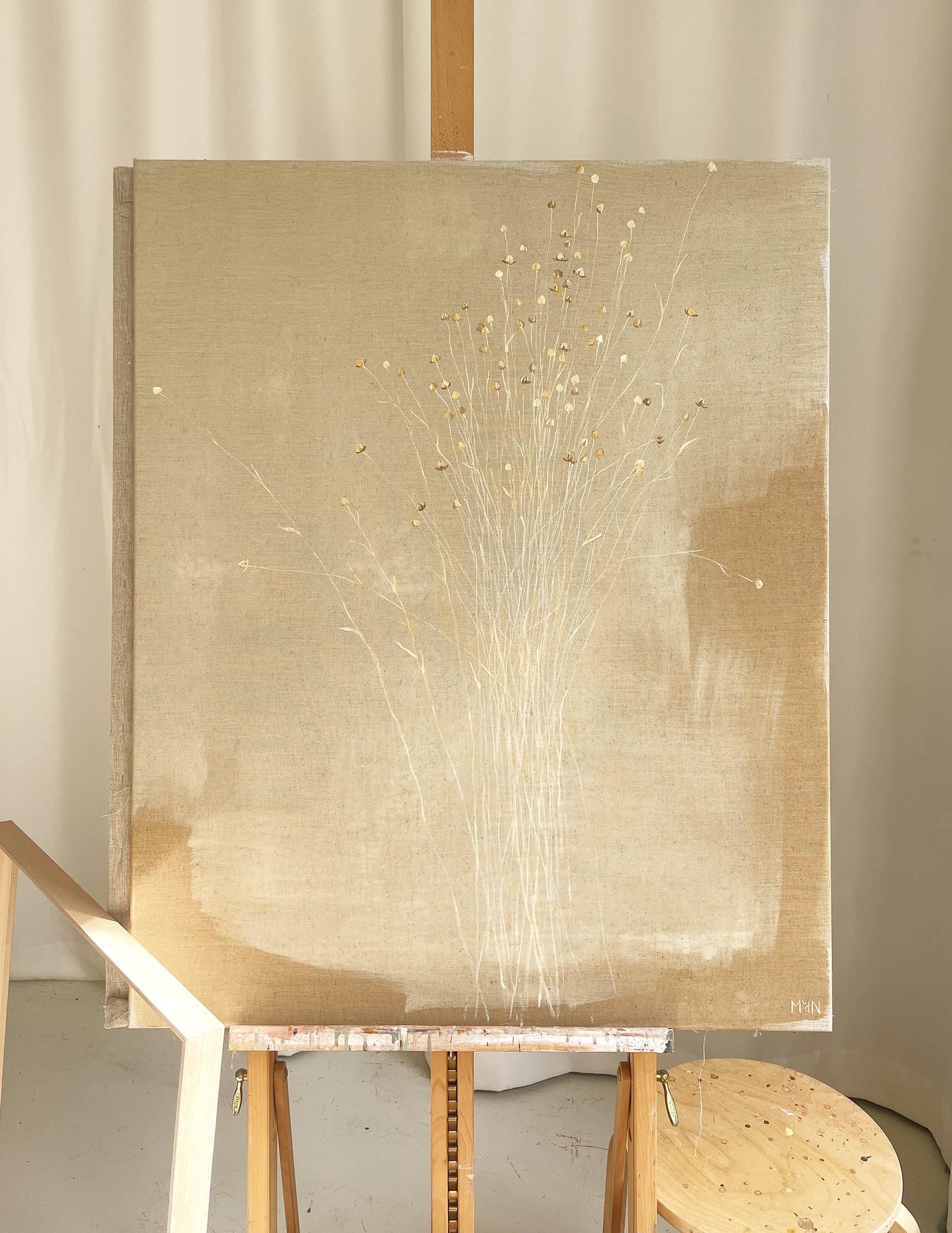 i used warm red tones and some madder pigment in the stem and the flowers on a powder pink and straw like background.